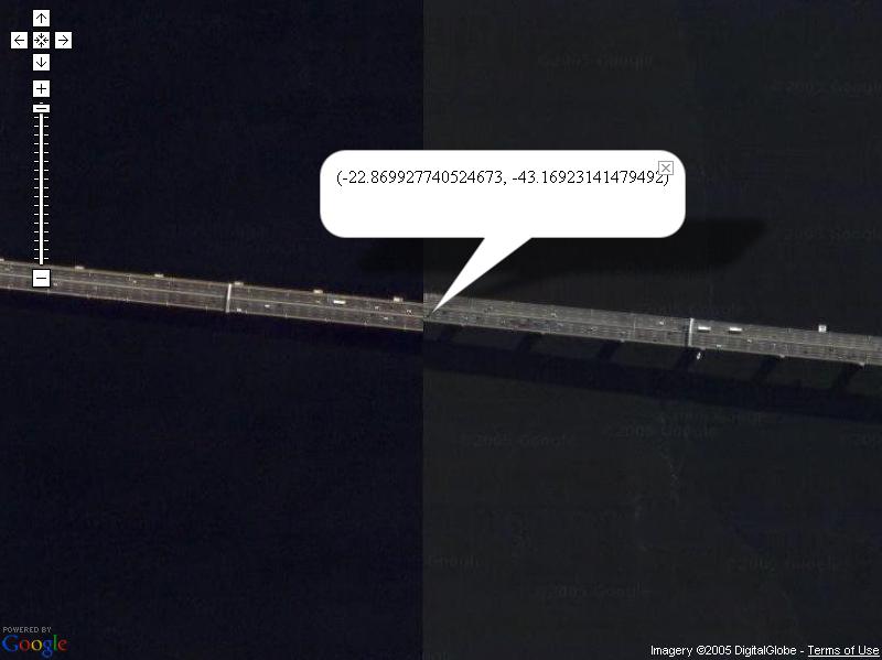 Here are some of the more egregious/obvious errors I've seen while navigating GoogleMaps: GoogleMaps v1 API: Stitching error in the middle of Guanabara Bay (Rio de Janeiro, Brazil):